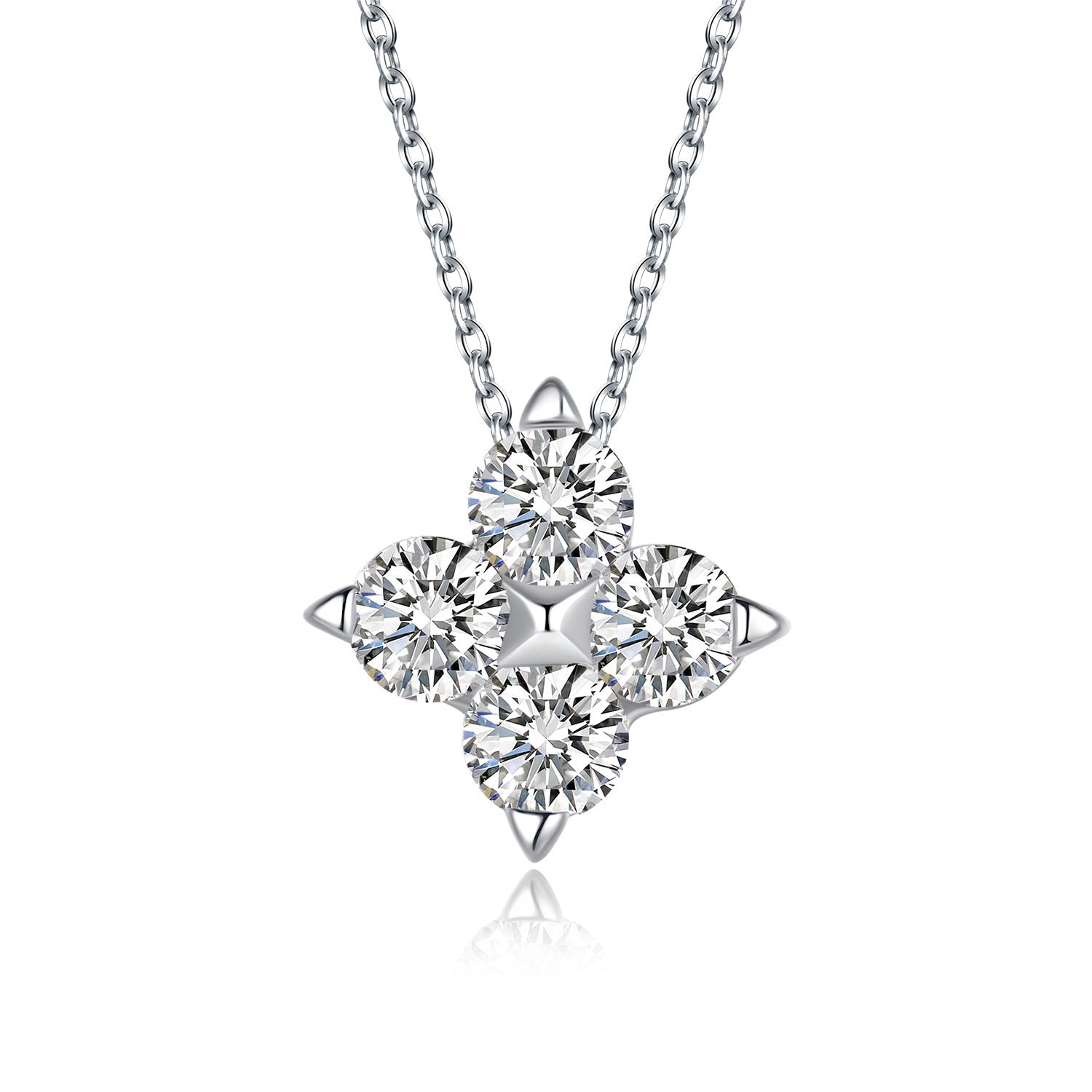 Ett exklusivt och strålande halsband som fångar blickarna med sin unika design. Detta fantastiska smycke har ett klöverformat hänge med fyra briljantslipade stenar i silverinfattning - en symbol för lycka och elegans.