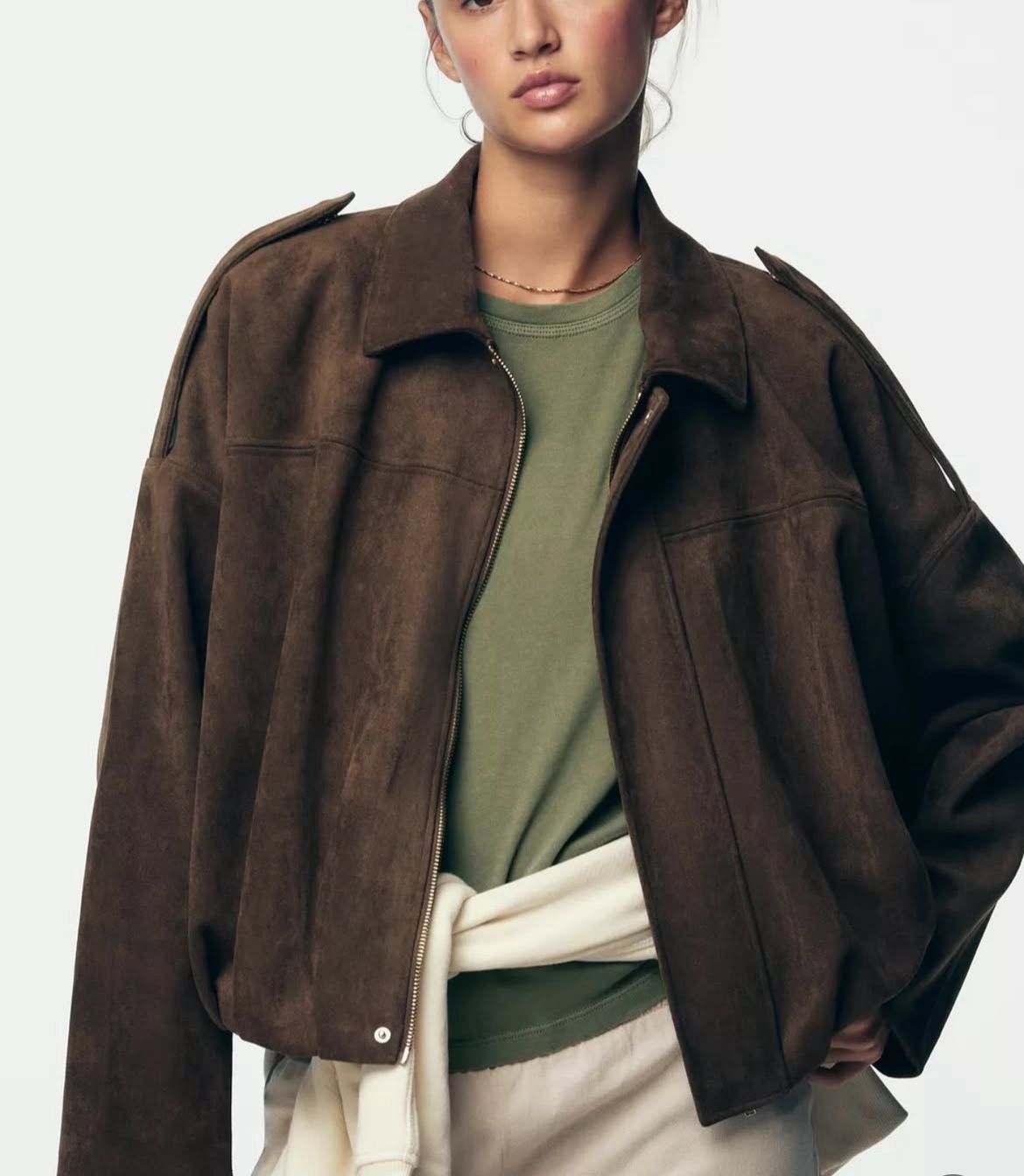 Tillverkad i slitstark mockaimitation med hel dragkedja framtill, klassisk nedvikt krage och långa ärmar – en perfekt jacka för alla säsonger.