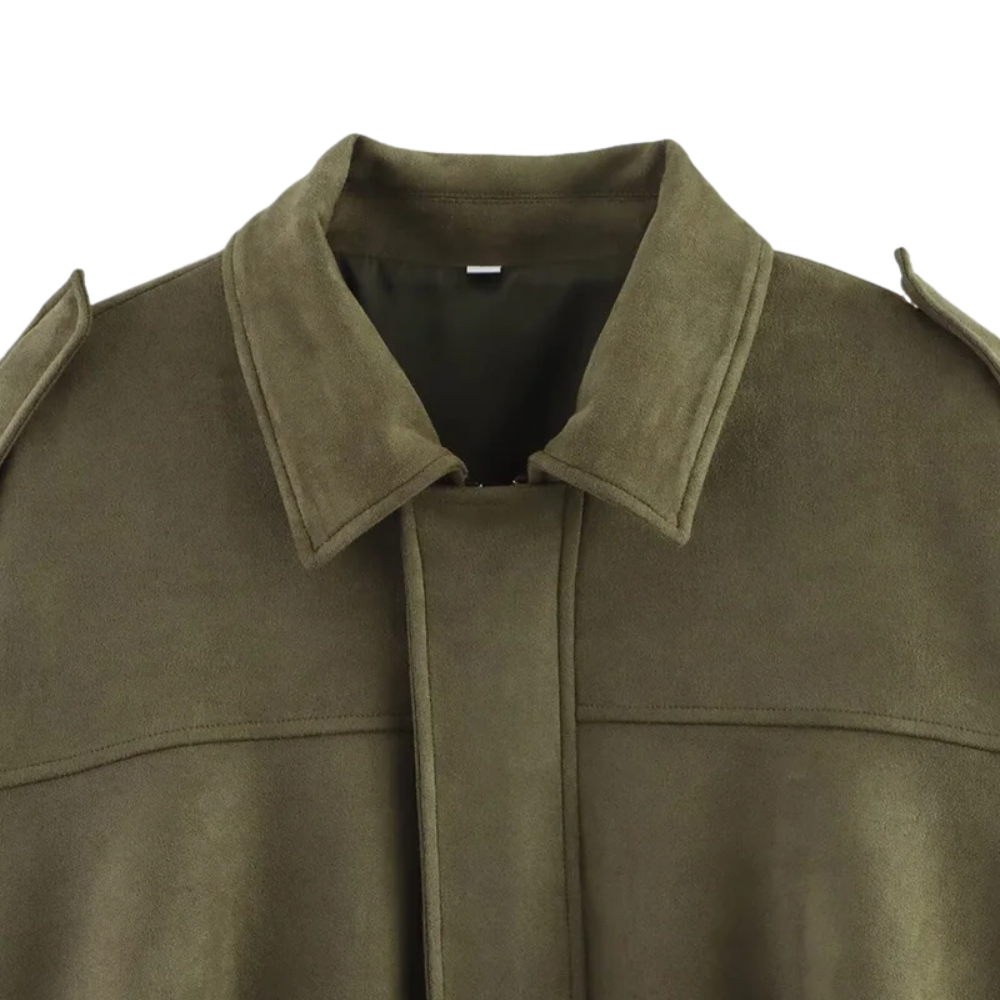 Tillverkad i slitstark mockaimitation med hel dragkedja framtill, klassisk nedvikt krage och långa ärmar – en perfekt jacka för alla säsonger.
